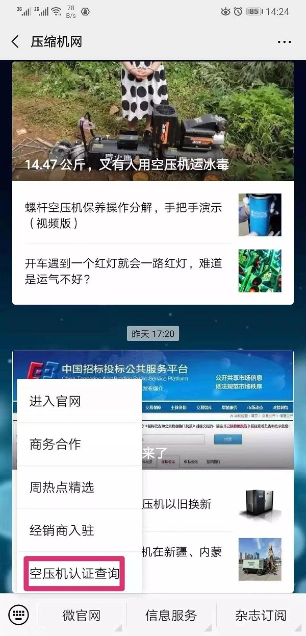 打开压缩机网公众号,点击“微官网”栏目“空压机认证查询”